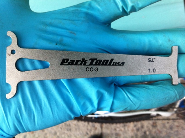 Pressing down with a bit of force caused the tool to go all the way down into the .75 wear indicator level. Most people will wait until the tool easily slips down instead of needing coaxing, but I'm measuring a Shimano chain here, and I don't like Shimano chains so this gives me a good excuse to get rid of the chain a little early. Besides, race season starts in a couple weeks and if a new chain is going to skip I want to find out now so I can start the season with all the new parts I need.